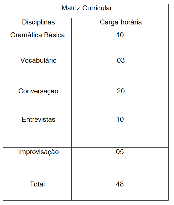 Carga Horária: 48 horas em aproximadamente 6 meses, podendo ser abreviado dependendo da dedicação e disponibilidade do aluno.